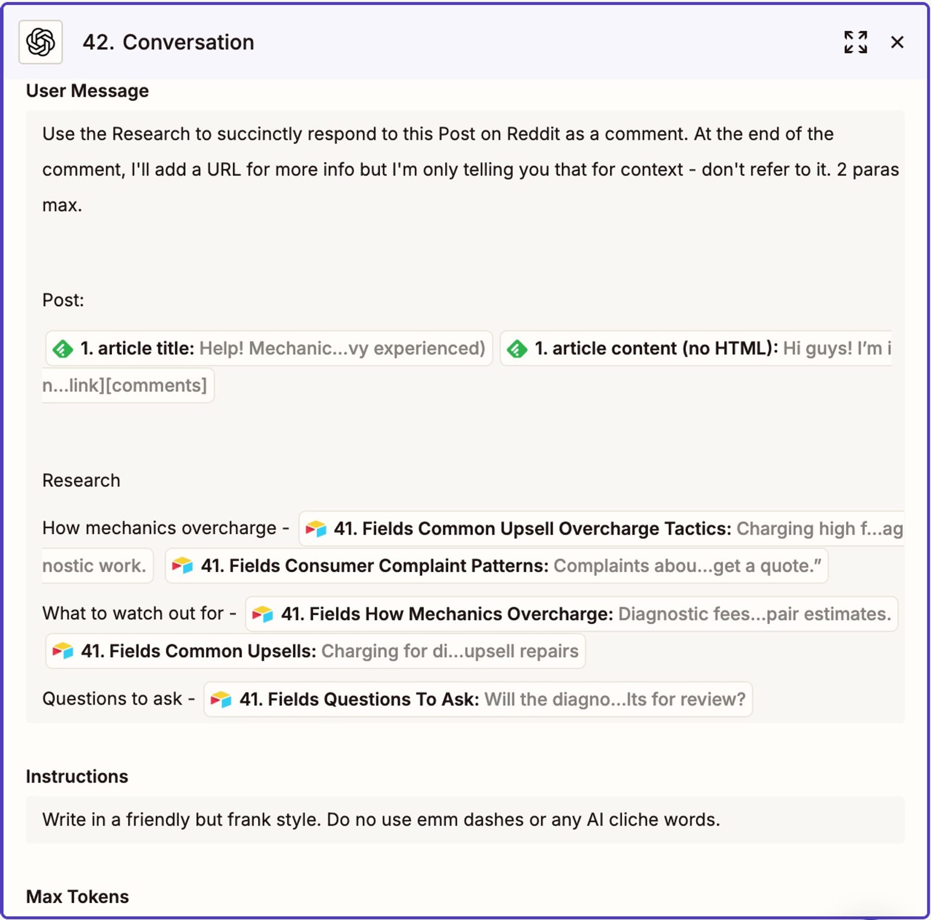 Finally, if the identified post is about a repair but not a quote, the system queries Service Buddy data held in Airtable about repairs, and then a ChatGPT zap takes that information, crafts a thoughtful comment that is then sent to Fawkes.