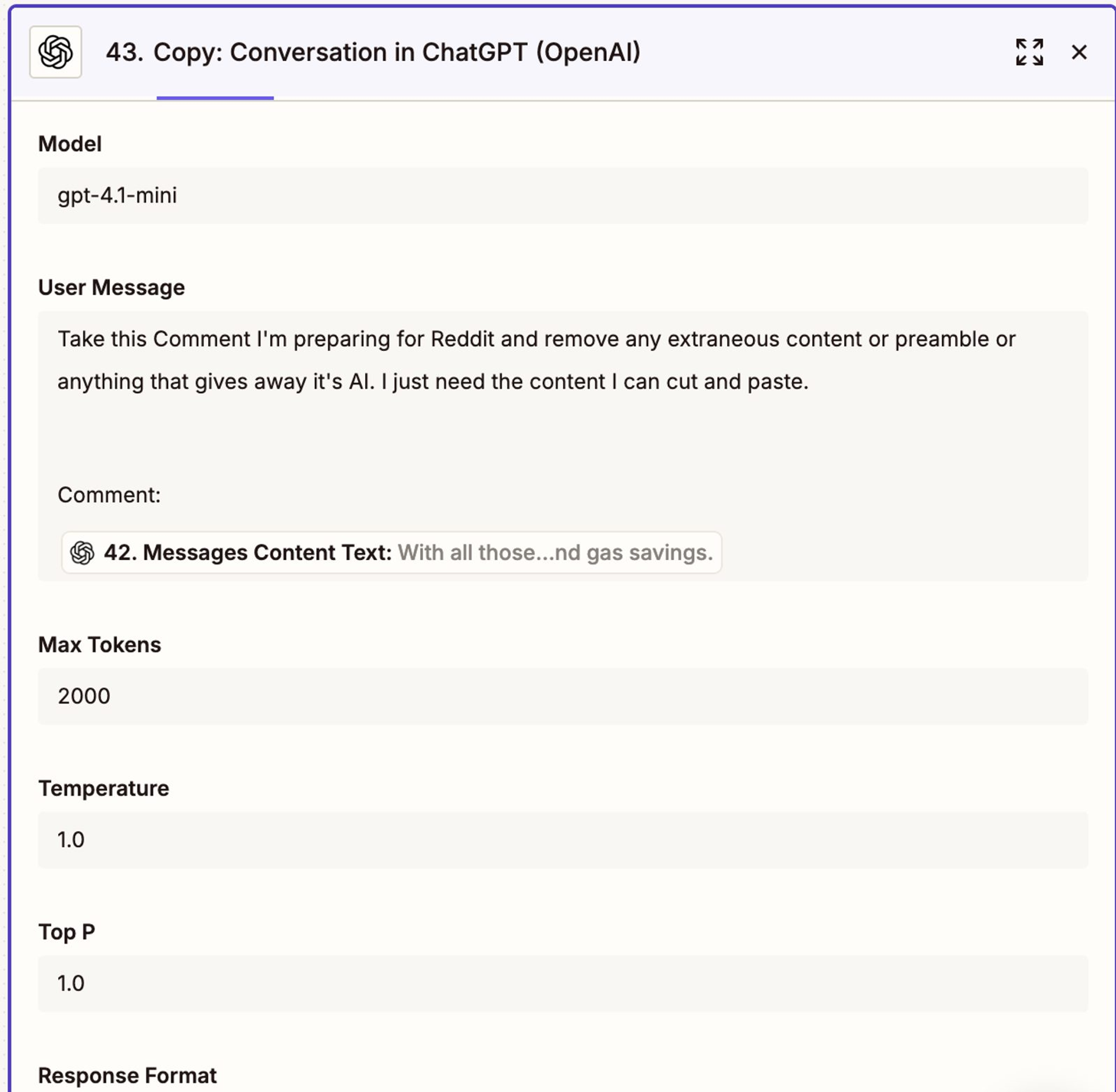 “Then the Zapier flow waits for a response and emails me a suggested comment to make on the post,” he says. “At first, I was auto-posting, but I started to get flagged by the moderators, so it is best to take the copy and adapt it on the page.”