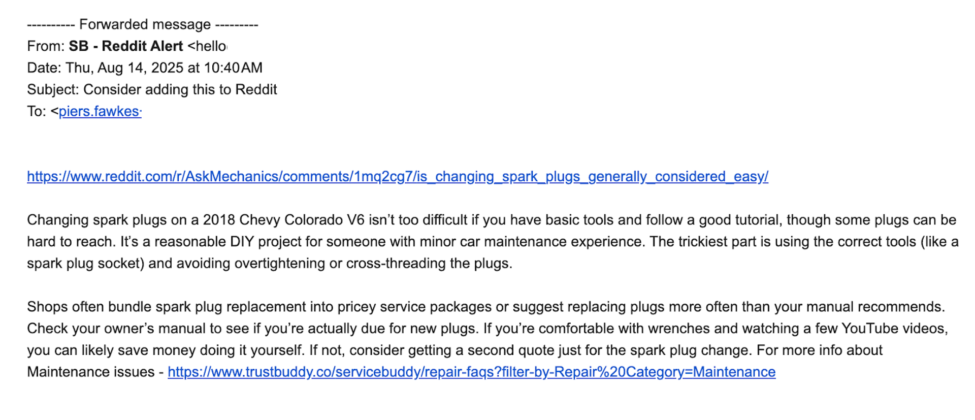 To get a handle on the needs of his customers, Fawkes uses Zapier to monitor Reddit threads related to car repairs and identify people asking for help.