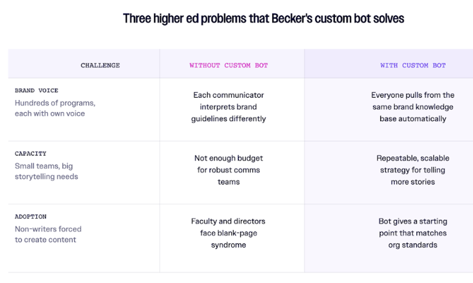 - Turn everyone into a communicator: From program directors who need to write newsletters to faculty members who want to promote their research, custom bots can give reluctant communicators a starting point that matches organizational standards.