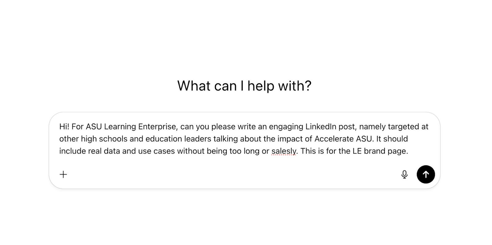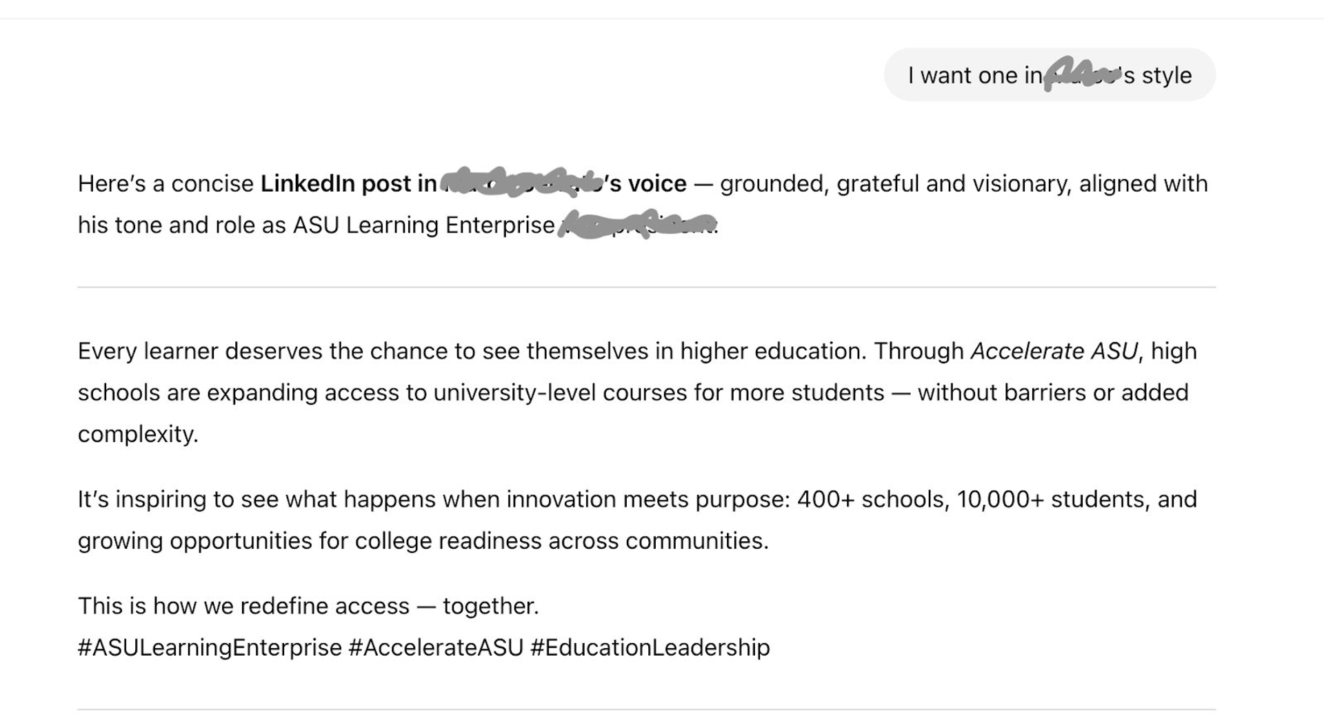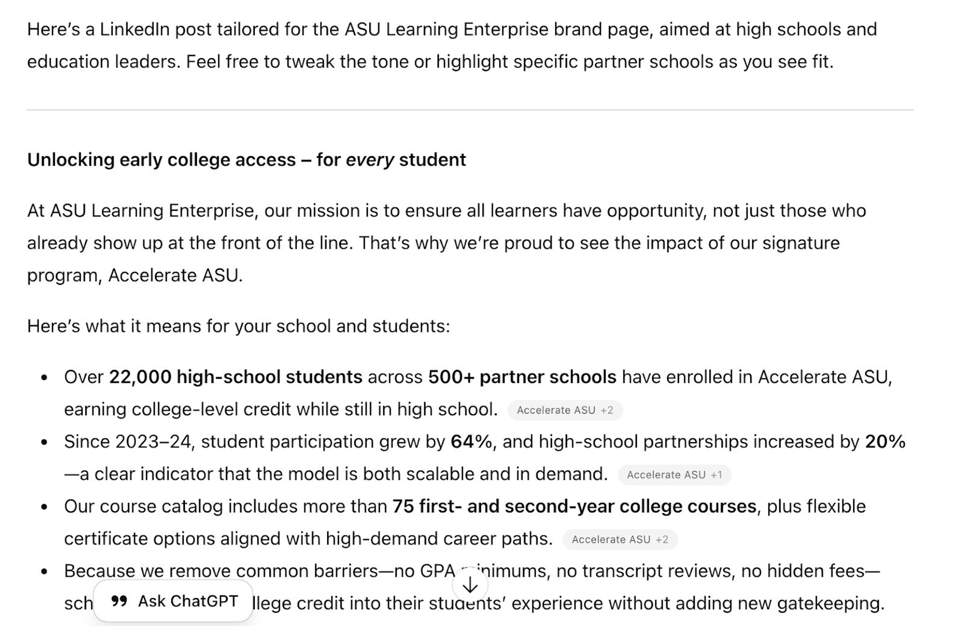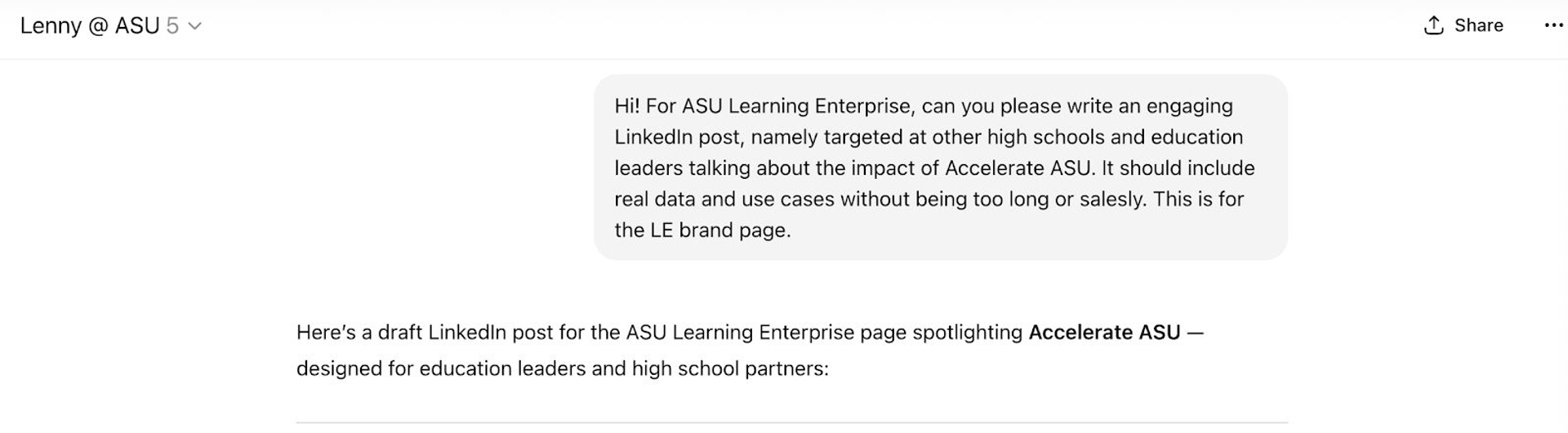 She prompts both standard ChatGPT and then asks Lenny to write a LinkedIn post about Accelerate ASU, the university’s dual enrollment program that allows high school students to earn college credit.