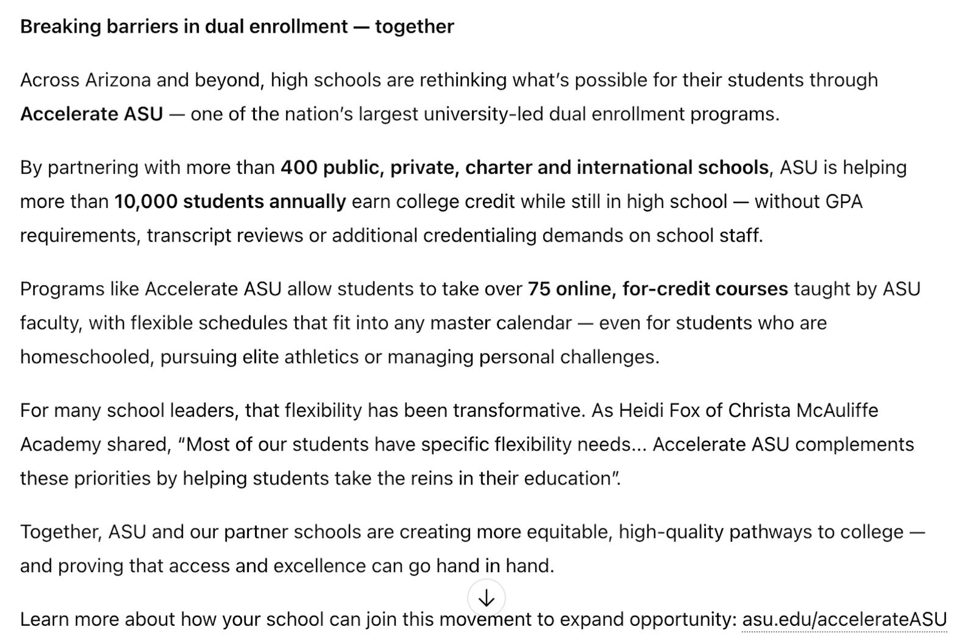 Lenny generates a concise, platform-appropriate post that incorporates specific statistics, such as how many learners are enrolled at any given time, and uses ASU’s brand guide and internal positioning to better communicate in the organization’s preferred voice.